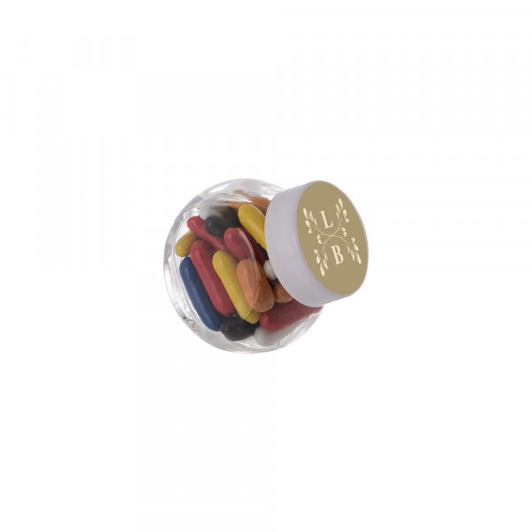 Micro glazen potje 50 ml met wit deksel, voorzien van een full colour sticker op het deksel en gevuld met Dropstaafjes mix