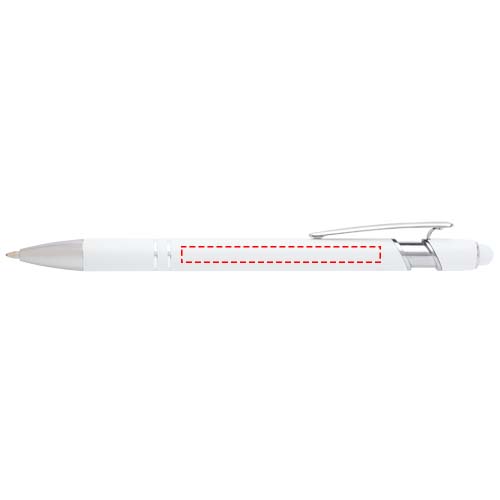 De Kish balpen met zilveren afwerking heeft een houder van gerecycled aluminium met een siliconen touch stylus. Gerecycled aluminium vermindert de hoeveelheid afval op stortplaatsen en draagt bij aan het behoud van natuurlijke hulpbronnen, met als doel de uitstoot van broeikasgassen te verminderen. Inktkleur: Blauw. Schrijflengte: 800 meter. Stiftmaat: 1,0 mm.
