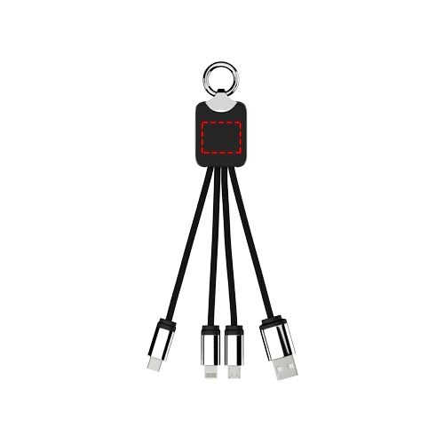 Oplaadkabel met oplichtend logo en rubberen en metalen afwerking, uitgerust met drie aansluitingen (Type C, Android, iPhone). Maximaal drie apparaten kunnen tegelijkertijd worden opgeladen. Lengte van de kabels (inclusief stekkers): 10 cm. RPET kunststof kabel en de verpakking is gemaakt van gerecycled papier en gerecyclede kunststof.